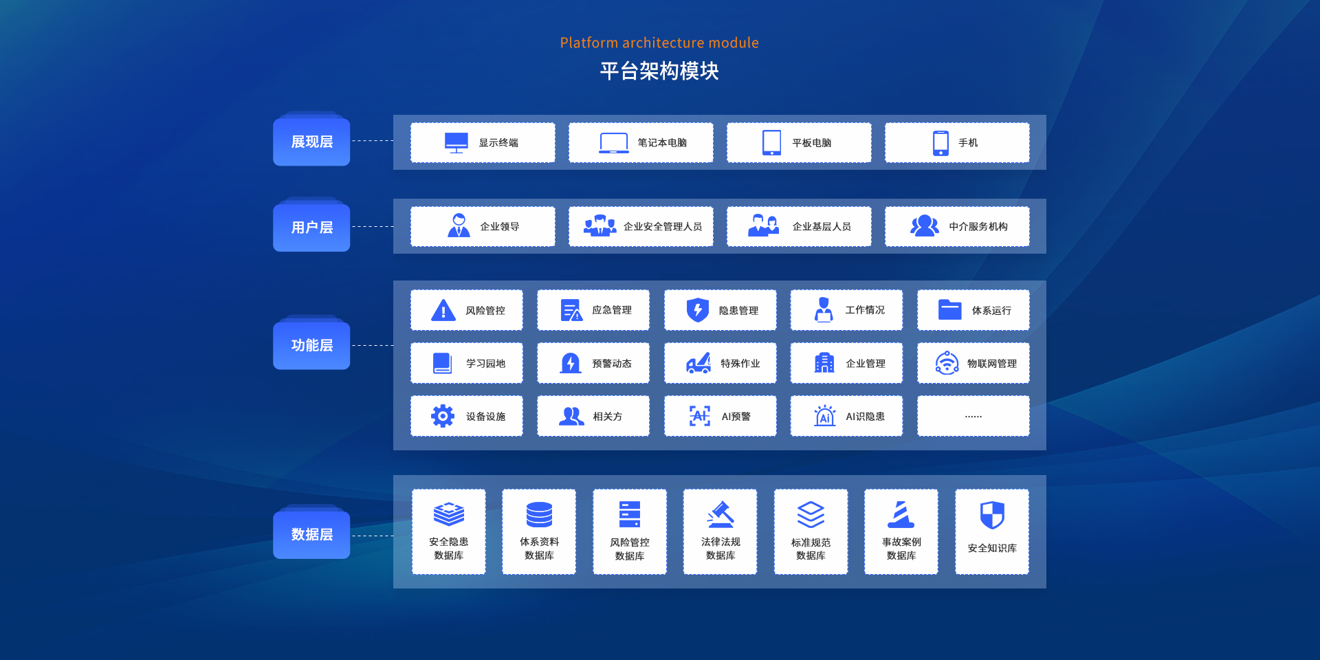 系統提供企業基本信息、安全管理架構、安全投入、涉危情況、行業資質、安全培訓、職業衛生、涉塵涉爆、有(受)限空間、第三方檢測、檢驗等15個功能模塊,可根據企業實際情況進行選用。