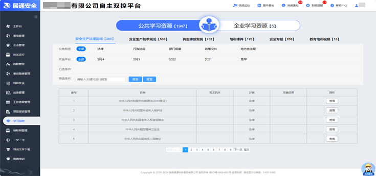 平臺配置法律法規、技術規范、典型事故案例、安全專題、培訓課件等多個維度學習資料,并定期更新。企業可根據需要自主下載,也可上傳本單位學習資料,提高安全管理專業知識與技能水平。