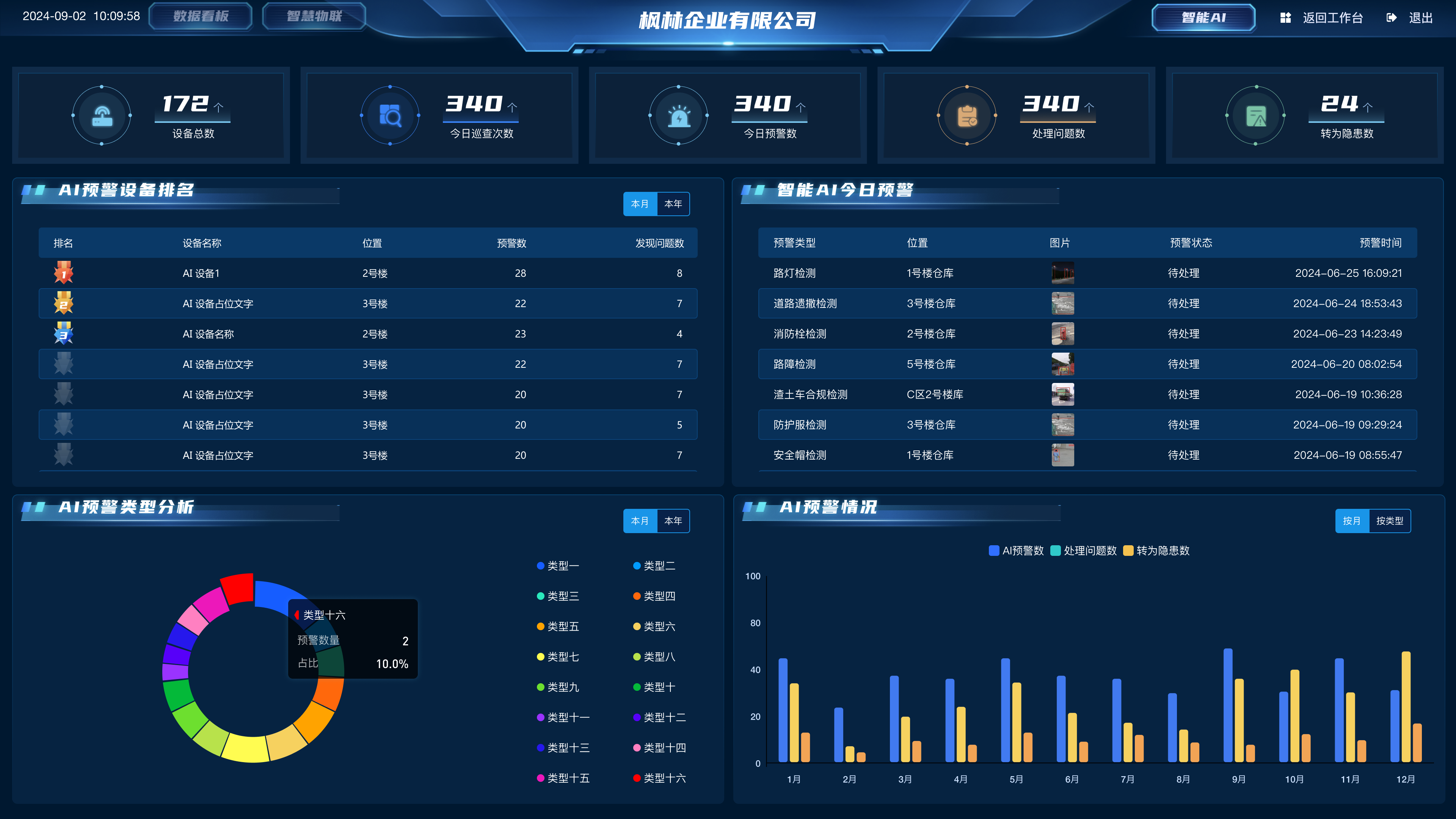 構建可視化數據中心看板集成匯總企業安全生產運行數據,涵蓋隱患情況、風險巡查情況、工作完成情況、預警預告情況、到期提醒、物聯報警等,便于負責人全盤掌握企業安全管理動態。